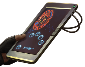 In numerous LucasArts games, a datapad interface is displayed on-screen to present the game menu, including inventory, mission objectives, level maps, and other relevant details.