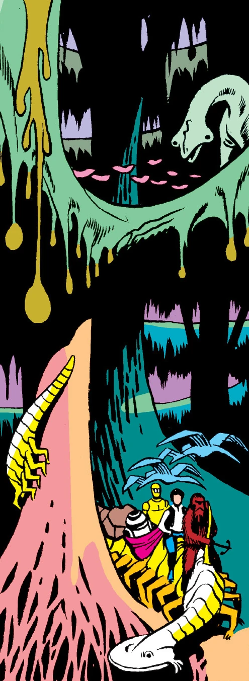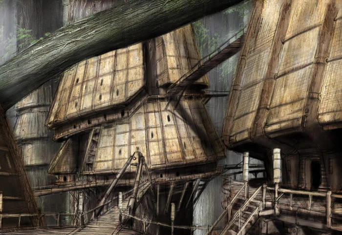 The majority of the planet resembled a vast swamp, teeming with wildlife and characterized by saturated soil and plentiful water. The planet's ecology was often described as a "layered deathtrap" due to the increasing danger posed by local fauna at lower levels. According to Wookiee traditions, this vertical ecosystem was divided into seven distinct levels. Wookiee civilization was primarily concentrated on the uppermost, seventh level, with only the most courageous venturing below the fourth. Chewbacca notably differed from most Wookiees, frequently traveling below this depth. The lowest level was known as the Shadowlands, sometimes referred to as the "notherworld."