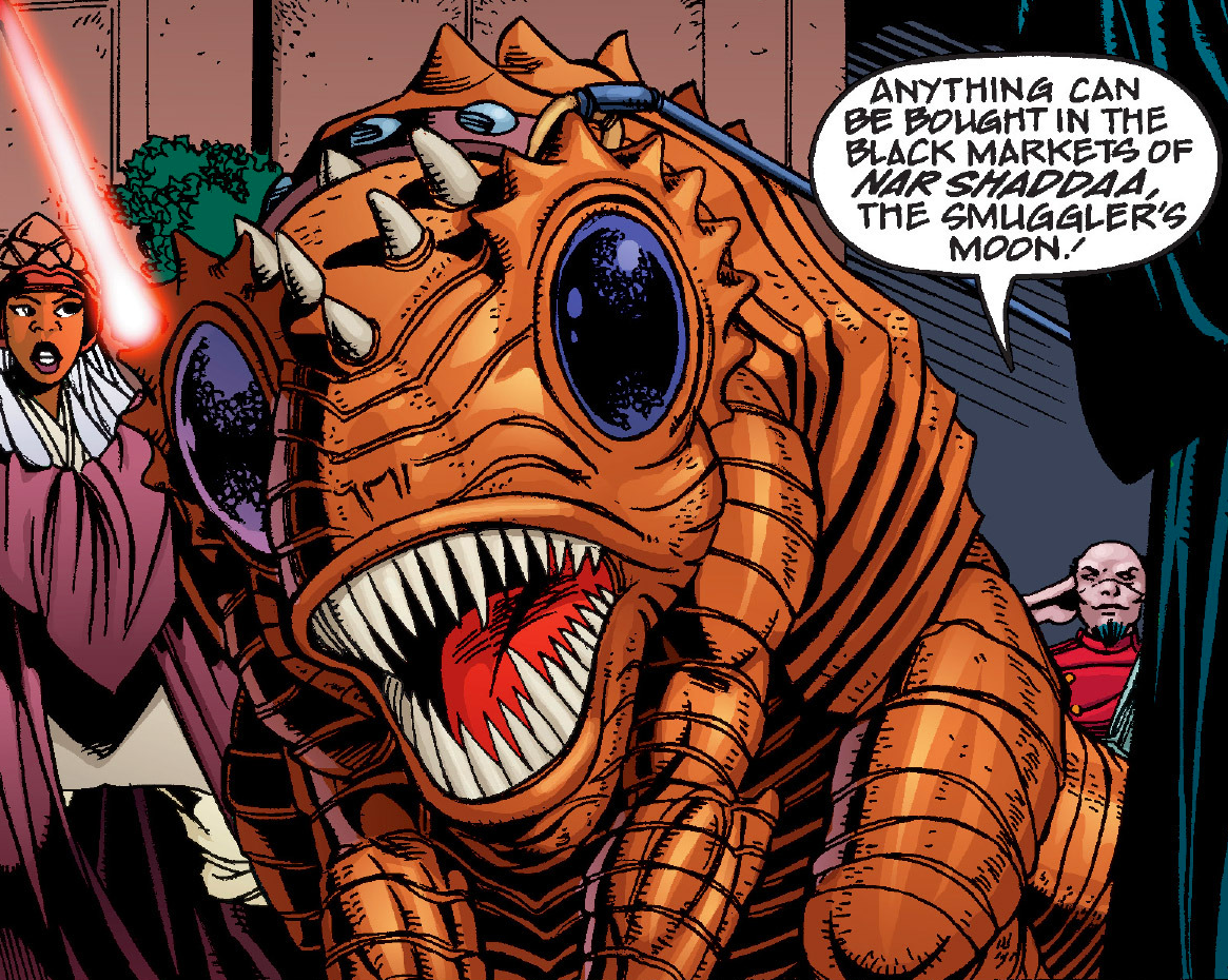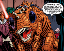 The word "dog" was at times employed as a derogatory term. A Mandalorian mercenary once used it to describe the bounty hunter Durge, referring to him as Jaing's "dog." Similarly, when C-3PO's head was temporarily attached to a B1-series battle droid during the First Battle of Geonosis, he exclaimed, "Die, Jedi dogs!" Han Solo once commented that Gamorreans "are as dumb as a box of rocks and sleep like a dog." Conversely, the phrase "top dog" was used as a compliment, as when Canderous Ordo used it to refer to the best bounty hunter on Taris.