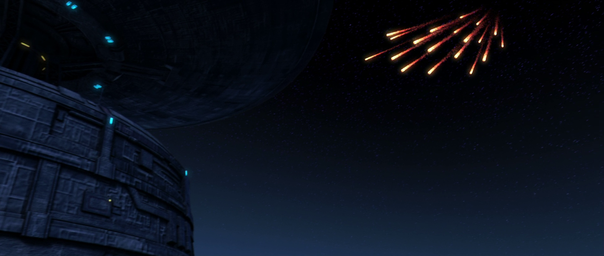 A meteor shower is pictured here, utilized as concealment by Droch-class boarding ships from the Separatist faction, descending towards Rishi Station.