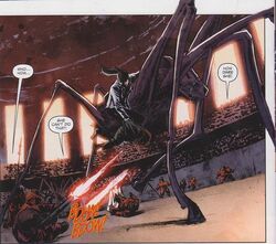 On the world of Nalyd, the native Nalydian people had domesticated a species of giant spiders. These arachnids were employed as mounts and beasts of burden, being larger in size than a fully grown Human. In the course of the Skirmish on Nalyd, Ania Solo, a junk dealer, took control of one of these Nalydian giant spiders while trying to liberate a convicted criminal named Dieben. Ania, along with her friend Jao Assam, an Imperial Knight, sought to interrogate Dieben concerning the location of the renegade Sith known as Darth Wredd. During their escape, the authorities of Nalyd were seen riding several of these giant spider mounts. Ania's spider was struck, resulting in its fall from the pinnacle.