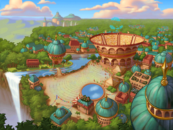 The Coliseum Plaza was an open space at ground level within Theed, the capital city situated on the planet of Naboo. This area was home to several entertainment spots, specifically the Theed Coliseum, the Theed Music Hall, and the Naboo Puppet Theater, in addition to a circular, decorative pond. Constructed on the side of a cliff and near a waterfall, the plaza's surface was covered in sandstone-like tiles arranged in a circular design. From the plaza, one could observe Theed Royal Palace off in the distance.