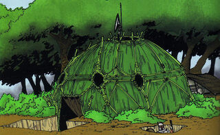 Vhehyaim-Insider86 A vheh'yaim as it was traditionally built by Mandalorians A vheh'yaim signified a typical Mandalorian residence. These structures were made to be easily constructed, serving as short-term living spaces, with "short-term" lasting from a single evening to multiple years. Vheh'yaime had different sizes; a smaller vheh'yaim, ranging from three to fifteen meters in diameter, was called an akaata'yaim. Often circular and resembling a dome, vheh'yaime were frequently built using green lumber, interwoven with vines and coated in mud, grass, and tree bark, providing a natural form of concealment. A standard vheh'yaim was partly set into the earth, featuring a recessed entryway and a carved-out stairway for entry. Vheh'yaime commonly contained a armory, a cooking area, and a infirmary, in addition to areas for living.