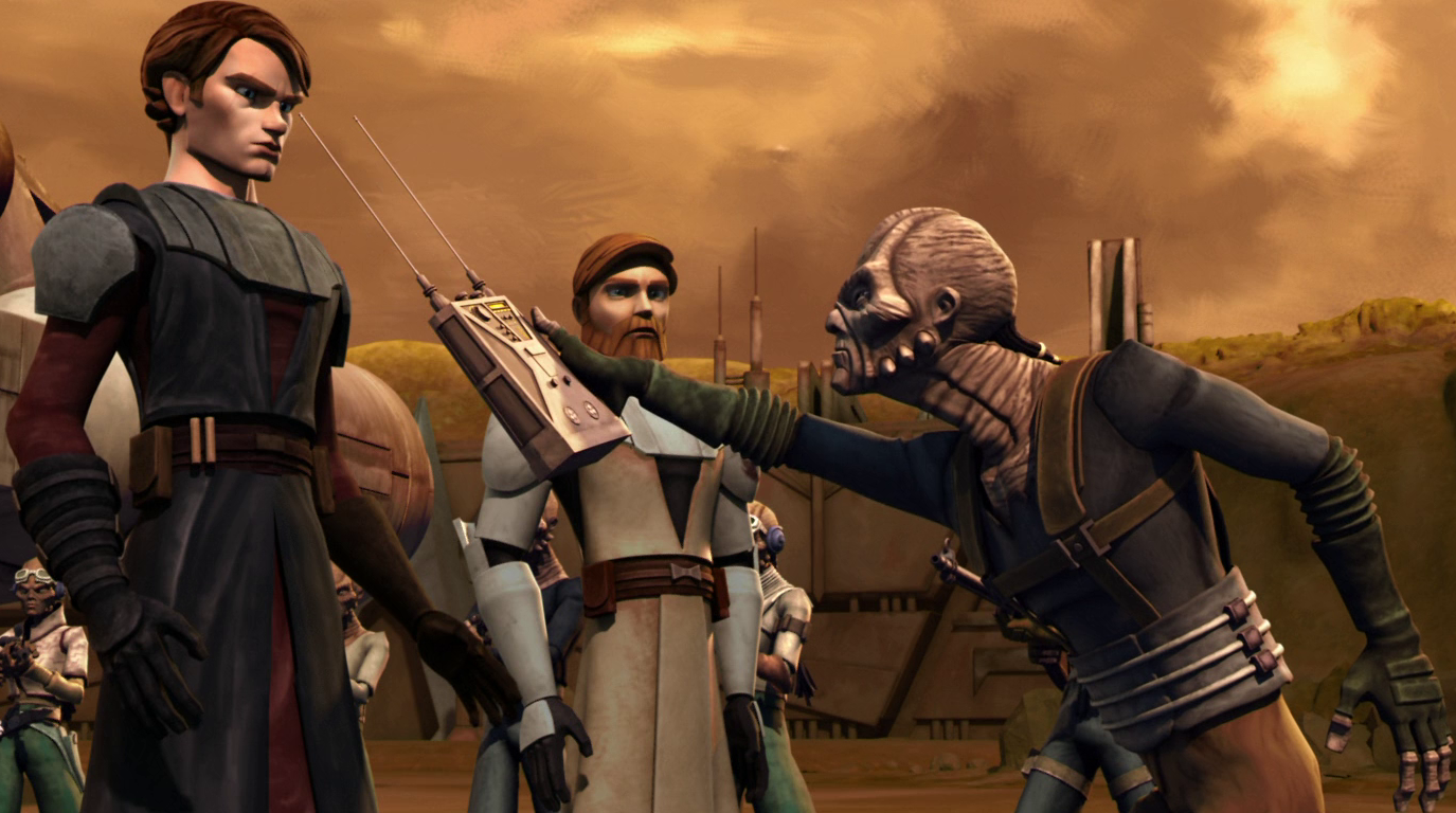 At Hondo Ohnaka's pirate outpost, Anakin Skywalker and Obi-Wan Kenobi undergo a weapons check.